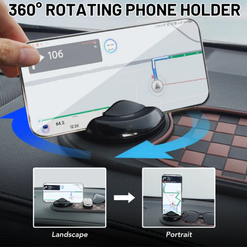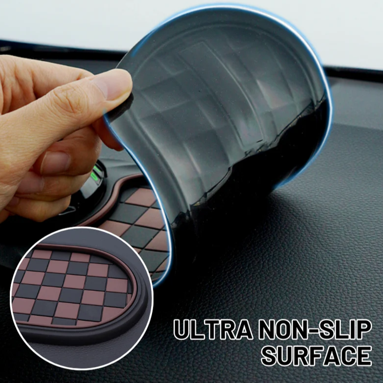 Made from a sticky, high-friction material that grips firmly to your dashboard and holds items like phones, sunglasses, keys, or bottles without sliding—no glue or suction needed.