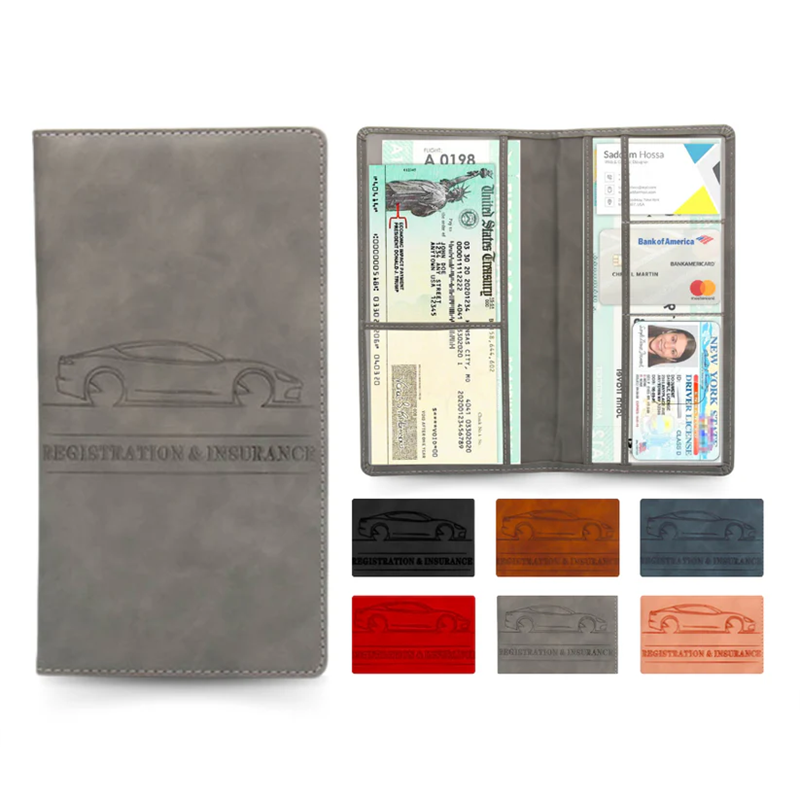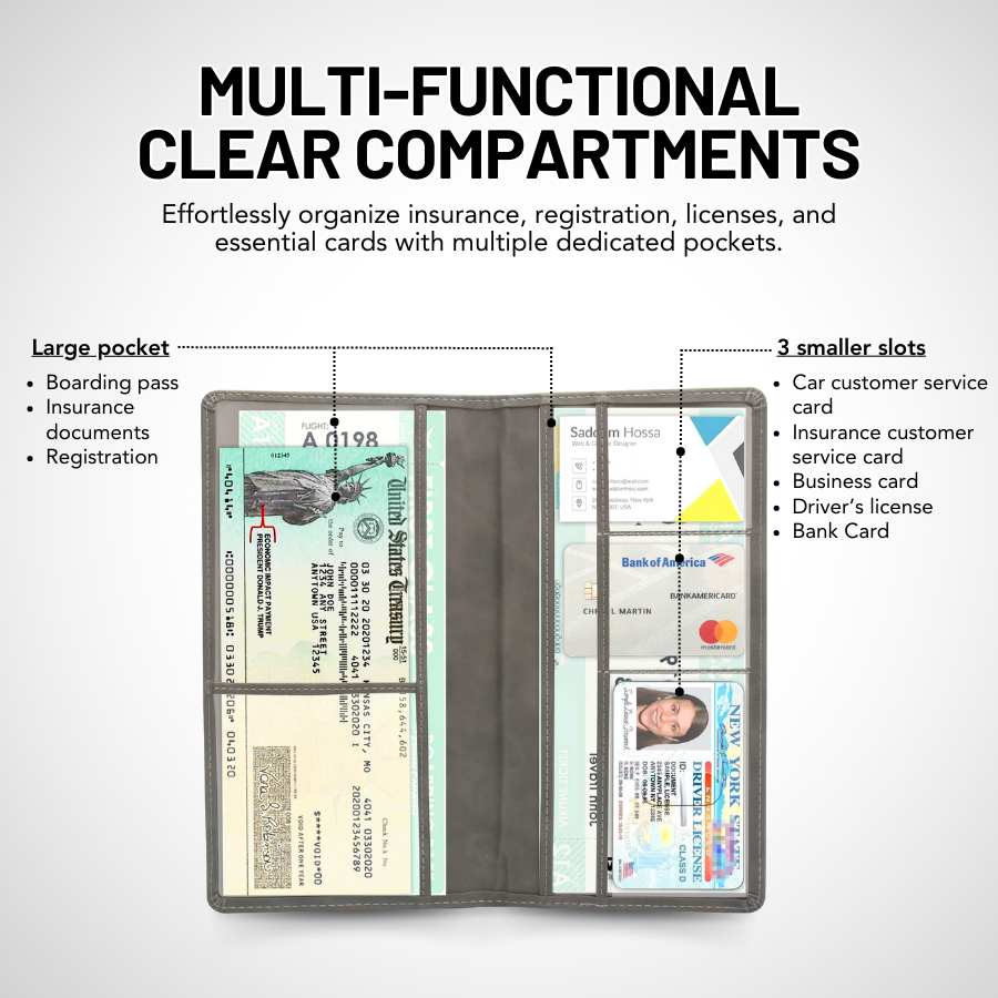 Organize all your essential documents effortlessly with a large pocket for insurance papers, 2 dedicated registration pockets, and 3 smaller slots for licenses, ID cards, business cards, or roadside assistance cards.